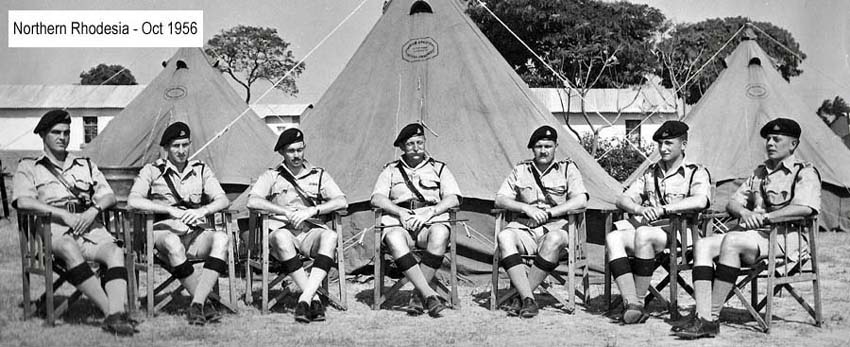 In October 1956 three platoons of the Police Mobile Force were dispatched to Northern Rhodesia to assist during the Copper Belt Riots there. During their stay they were camped at Ndola and the Roan-Antelope Mine, Luanshya. This picture, surely as fine a body of Colonial Police Officers as you're ever likely to see, was taken at the Luanshya camp. (L-R) Harry Edmunds, John T. Parker, Reg Brill, Jeff York, John Wilkes, Derek Harling and Jim Wilkinson.