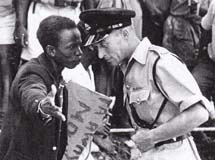 Peter Hewit was a man with considerable experience having served in the Kenya and Cyprus Police during their days of crisis. So, we can see from the picture (right) that his presence outside Ryalls Hotel in Blantyre on 26th January 1960 at the demonstration there during the visit of Prime Minister Harold Macmillan left him unfazed and, always an understanding man, prepared to listen to a member of that demonstration. However, we all know that the scale of this demonstration was blown up beyond all proportion leading to a judicial enquiry which completely exonerated the Police against allegations of brutality. In his report Mr Justice Southworth commented that the amount of skin lost would hardly cover an area of "one square inch" and the amount of blood shed would "test the capacity of a mustard spoon". To mark this occasion and the clear vindication of those on duty it was deemed appropriate that those present be initiated into the "Honourable Order of the BOOTLESS BOBBIES Click here to read all about it