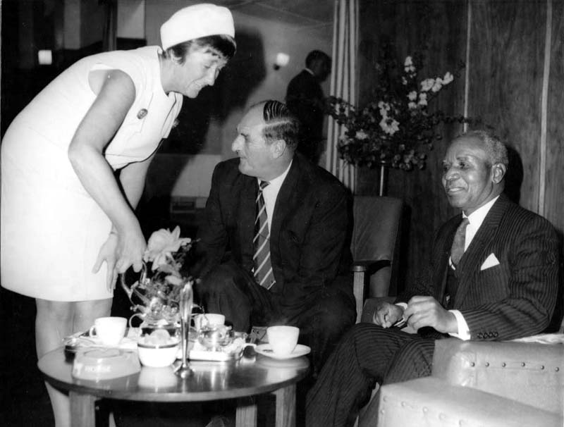 The Commissioner of Police, Peter Long, entertains the President, Hastings Banda, in the Officers Mess at Police Headquarters and Pauline Wilkes does the honours.